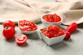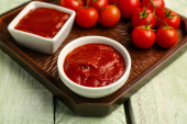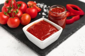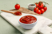 Miska ze smaczną pastą pomidorową na tle grunge 'u