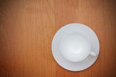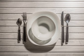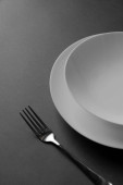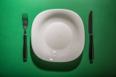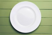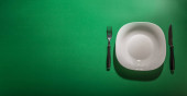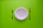 Pusty biały talerz na zielonym tle. Wiosenne tło. Widok z góry, płaskie tło. Teksturowany obiekt, ostrość selektywna.