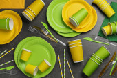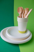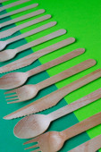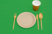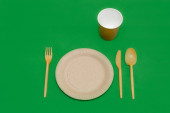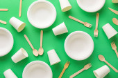 Ekologiczne jednorazowe naczynia wykonane z drewna bambusowego i papieru na zielonym tle. Łyżki drapowane, widelce, noże, miski bambusowe z papierowymi miseczkami, abstrakcyjne