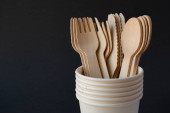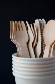 Ekologiczne jednorazowe naczynia wykonane z drewna bambusowego i papieru na zielonym tle. Łyżki drapowane, widelce, noże, miski bambusowe z papierowymi miseczkami, abstrakcyjne