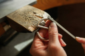 Zdjęcie "Zbliżenie złotników ręka robi złoty lub srebrny pierścień lub diament za pomocą narzędzi złotników. Tworzenie pierścienia z diamentów" może być wykorzystywane do celów osobistych i komercyjnych zgodnie z warunkami zakupionej licencji Royalty-free. Obraz jest dostępny do pobrania w jakości wysokiej rozdzielczości do 5760x3840.