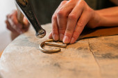 Zbliżenie złotników ręka robi złoty lub srebrny pierścień lub diament za pomocą narzędzi złotników. Tworzenie pierścienia z diamentów