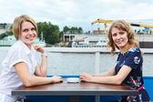 trzy młode kobiety kaukaski stojąc na balkonie budynku wieżowiec miasta