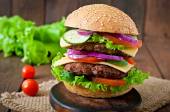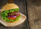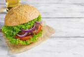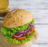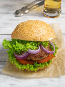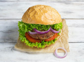 Burger z kotlet z wołowiny, sałata, cebula i pomidor