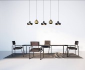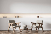 Wnętrze nowoczesnego salonu z białymi ścianami, betonową podłogą, dwoma wygodnymi białymi fotelami stojącymi w pobliżu okrągłego stołu kawowego i jasnym drewnianym kredensem. 3d renderowanie