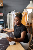 Młody poważny Afroamerykanka krawiec robi wzór tekstylny dla nowych ubrań podczas rysowania linii z kredą blisko drewnianej linijki