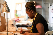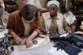 Zdjęcie "Afroamerykanka w stroju casualwear stojąca przy stole i pakująca nowe ubrania w pudełko tekturowe podczas pakowania towarów w papier" może być wykorzystywane do celów osobistych i komercyjnych zgodnie z warunkami zakupionej licencji Royalty-free. Obraz jest dostępny do pobrania w jakości wysokiej rozdzielczości do 5760x3840.