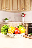 Kolorowe świeże warzywa sałatka w szklanej filiżance i składników żywności na stole licznik kuchnia z rozmytym tle pięknej nowoczesnej kuchni, zdrowej koncepcji żywności naturalnej z miejsca kopiowania.