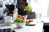 Kolorowe świeże warzywa sałatka w szklanej filiżance i składników żywności na stole licznik kuchnia z rozmytym tle pięknej nowoczesnej kuchni, zdrowej koncepcji żywności naturalnej z miejsca kopiowania.