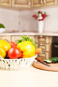 Kolorowe świeże warzywa sałatka w szklanej filiżance i składników żywności na stole licznik kuchnia z rozmytym tle pięknej nowoczesnej kuchni, zdrowej koncepcji żywności naturalnej z miejsca kopiowania.