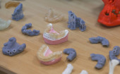 Widok boczny protezy stomatologicznej przygotowanej dla pacjenta. W tle pacjent czeka na operację protezy stomatologicznej..