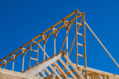 Zdjęcie "Konstrukcja drewnianej belki dachowej z ramy kratownicy dla nowo wybudowanego domu kija" może być wykorzystywane do celów osobistych i komercyjnych zgodnie z warunkami zakupionej licencji Royalty-free. Obraz jest dostępny do pobrania w jakości wysokiej rozdzielczości do 5760x3840.