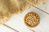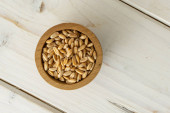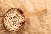 Organiczny jęczmień perłowy w dwóch słomkowych talerzach na drewnianym stole, zbliżenie, widok z góry.