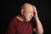 Łysa kobieta dotykająca głowy ręką, cierpiąca na ból głowy po chemioterapii. Nieszczęśliwa, bezwłosa, chora kobieta z migreną w domu. Koncepcja onkologii. Opieka zdrowotna, medycyna