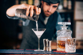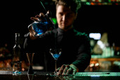 barman miesza koktajl Blue Lagoon w szklance przy barze w restauracji