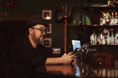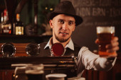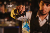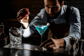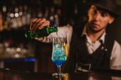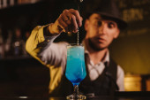barman miesza koktajl Blue Lagoon w szklance przy barze w restauracji