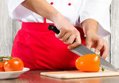 Profesjonalny kucharz krojący pomidory przy stole z białego marmuru w pomieszczeniach, zbliżenie