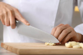 Zdjęcie "Profesjonalny kucharz krojący pomidory przy stole z białego marmuru w pomieszczeniach, zbliżenie" może być wykorzystywane do celów osobistych i komercyjnych zgodnie z warunkami zakupionej licencji Royalty-free. Obraz jest dostępny do pobrania w jakości wysokiej rozdzielczości do 5760x3840.