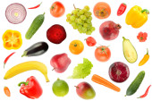 Wiele świeżych warzyw i owoców spadających na białe tło