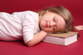 Little cute girl sleeping with books in the front of bookshelf. Concept of education, soft focus background