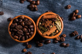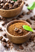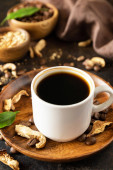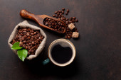 Zdrowy organiczny adaptogen energetyzujący. Kawa grzybowa w filiżance i ziarnie kawy, modny napój na kamiennym tle. Odbiór. Widok z góry. Przestrzeń kopiowania.