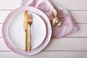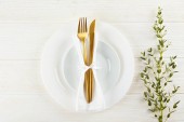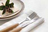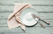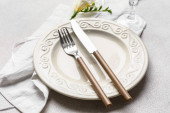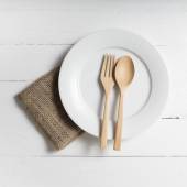 Talerz z widelcem i nożem na białym drewnianym tle