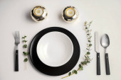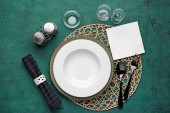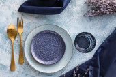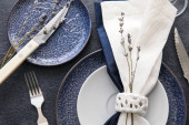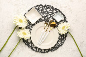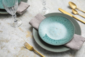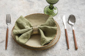 Tkanina stołowa z płytą i kompletem sztućców na szarym tle grunge