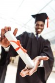 Dyplom magistra z czerwoną wstążką w rękach absolwenta afrykańskiego w czarnej sukni dyplomowej na białym tle. Absolwent Afryki kończy liceum i świętuje osiągnięcia akademickie