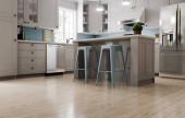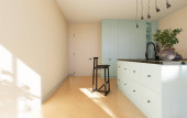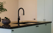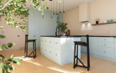 Nowoczesna przestronna, jasna kuchnia z nasłonecznieniem i ciemnymi akcentami. Wizualizacja 3D. Zielona kuchnia z minimalnymi frontami, czarne stołki bar, wyspa z szufladami i naczynia kuchenne.