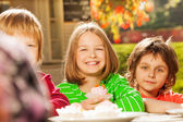Urocze dzieci picie gorącej czekolady na zewnątrz, wydatków dobry czas na wakacje w góry alpejskie