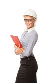 uśmiechający się architekt bizneswoman gospodarstwa plany na białym tle