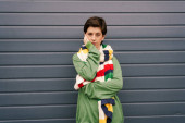 Zdjęcie "widok z tyłu brunetka krótkowłosy kobieta w pierścienie palców pozowanie z ręce za szyją izolowane na szary" może być wykorzystywane do celów osobistych i komercyjnych zgodnie z warunkami zakupionej licencji Royalty-free. Obraz jest dostępny do pobrania w jakości wysokiej rozdzielczości do 5760x3840.