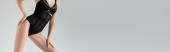 młoda wytatuowana kobieta w stylowej gorsetowej sukience patrząca na kamerę na szarym tle, baner