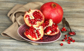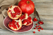 Soczysty dojrzałe granaty na drewnianym stole, na ciemnym tle