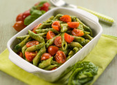 Smaczny zielony makaron z papryka i pomidory na drewnianym stole tło
