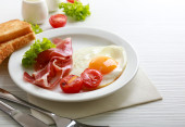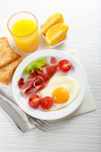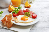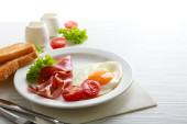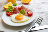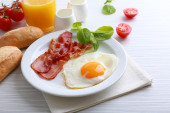 Zdjęcie "Bacon i jaj na kolor drewniany stół tło" może być wykorzystywane do celów osobistych i komercyjnych zgodnie z warunkami zakupionej licencji Royalty-free. Obraz jest dostępny do pobrania w jakości wysokiej rozdzielczości do 5760x3840.