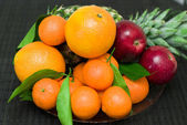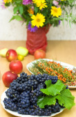 świeżych owoców, jabłka, winogron i brzoskwinie na stole