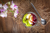Zdjęcie "Ukraińska zupa barszczowa z pączkami czosnkowymi, zieloną cebulą i bekonem, obok miska kwaśnej śmietany. Zupę wlewa się do lekkiej ceramicznej płytki. Naczynia stoją na jasnym tle." może być wykorzystywane do celów osobistych i komercyjnych zgodnie z warunkami zakupionej licencji Royalty-free. Obraz jest dostępny do pobrania w jakości wysokiej rozdzielczości do 5760x3840.