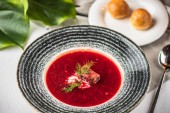 Ukraińska zupa barszczowa z pączkami czosnkowymi, zieloną cebulą i bekonem, obok miska kwaśnej śmietany. Zupę wlewa się do lekkiej ceramicznej płytki. Naczynia stoją na jasnym tle.