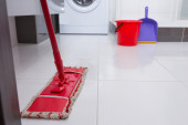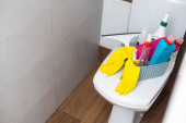 Zdjęcie "Blisko niebieskie wiadro z produktami czyszczącymi, szmata, mop są na podłodze w pięknej nowoczesnej łazience. Koncepcja sprzątania, przywrócenia porządku w domu" może być wykorzystywane do celów osobistych i komercyjnych zgodnie z warunkami zakupionej licencji Royalty-free. Obraz jest dostępny do pobrania w jakości wysokiej rozdzielczości do 5760x3840.