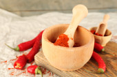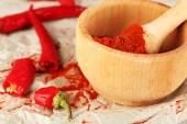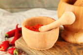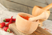 Pieprz czerwony w moździerzu z chili na drewniane tła