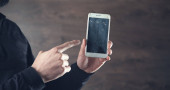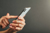kobieta ręcznie uszkodzony smartfon na brązowym tle