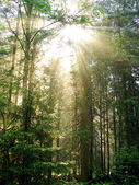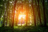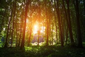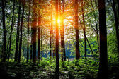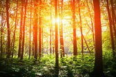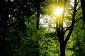 Słońce świeci przez las liściasty