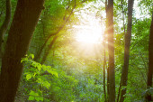 Słońce świeci przez las liściasty