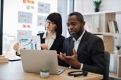 Zdjęcie "Pewny siebie wielokulturowy mężczyzna komunikujący się online za pośrednictwem laptopa, podczas gdy atrakcyjna biała kobieta demonstruje wykresy wzrostu. Efektywni partnerzy biznesowi omawiający projekt podczas rozmowy wideo." może być wykorzystywane do celów osobistych i komercyjnych zgodnie z warunkami zakupionej licencji Royalty-free. Obraz jest dostępny do pobrania w jakości wysokiej rozdzielczości do 5760x3840.