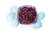 Kolaż z miskami smacznej czerwonej kiszonej kapusty na białym tle