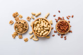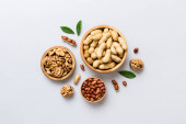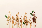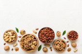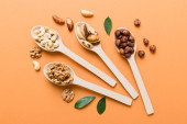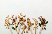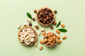 mixed nuts in white wooden spoon. Mix of various nuts on colored background. pistachios, cashews, walnuts, hazelnuts, peanuts and brazil nuts.