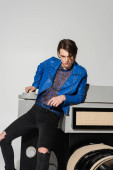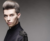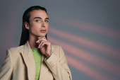 portret modnego modelu bigender w czarnej skórzanej kurtce trzymającej się za ręce blisko twarzy patrząc na kamerę odizolowaną na szaro