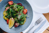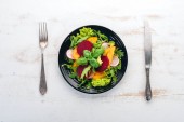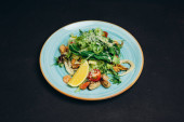 Letnia miska sałatkowa z grillowaną brzoskwinią, miękkim serem, orzechami włoskimi i świeżą rukolą na czarnym stole kuchennym, widok z góry.