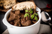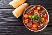 Koncepcja żywności Homemade Beef gulasz gulasz na czarnym tle z miejsca kopiowania